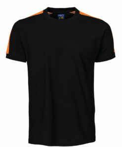 Puuvillainen t-paita, jonka olkapäillä fluoresoivaa kangasta.