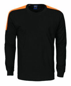 Pitkähihainen puuvillainen t-paita, jonka olkapäillä fluoresoivaa kangasta.