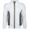 Collegetakki, jossa korkea kaulus. Olkapäillä fluoresoivaa kangasta. Hihansuissa ja helmassa resorit. Vetoketjutaskut.