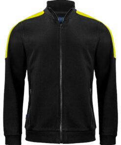 Collegepaita jossa on täyspitkä vetoketju edessä. Resorit helmassa ja hihansuissa. Sivutaskut vetoketjuilla. Värissä musta/keltainen-9910 on kontrastit hartioiden päällä näkyvyyden parantamiseksi.