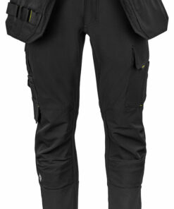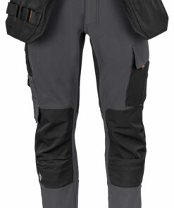 Joustavat työhousut mahdollistavat hyvän liikkuvuuden ja tuntuvat mukavilta päällä. Moderni istuvuus. Tilavat reisitaskut molemmin puolin. Vasemmalla tasku työkaluille ja kynille, puhelintasku, jossa tarrakiinnitys, ja ID-korttipidike. Oikealla mittatasku ja tasku työkaluille, jossa puukkonappi. Leveämpi vyölenkki takana estämään vyöstä tulevaa painetta. Mahdollisuus kiinnittää MOLLE-järjestelmä molemmille sivuille. Muotoillut polvet. Sisäpuolella polvisuojataskut, jotka voidaan säätää kahdelle eri korkeudelle.