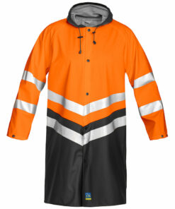 Sadetakki huomioväreissä, helman pituus 100 cm. Säädettävä huppu. Säädettävät hihansuut. Ommellut ja hitsatut saumat. Luokka 3.