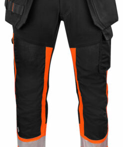 Joustavat työhousut mahdollistavat hyvän liikkuvuuden ja tuntuvat mukavilta päällä. Moderni istuvuus. Tilavat reisitaskut molemmin puolin. Vasemmalla tasku työkaluille ja kynille, puhelintasku, jossa tarrakiinnitys, ja ID-korttipidike. Oikealla mittatasku ja tasku työkaluille, jossa puukkonappi. Muotoillut polvet. Sisäpuolella polvisuojataskut, jotka voidaan säätää kahdelle eri korkeudelle. Heijastavat yksityiskohdat.