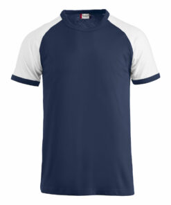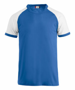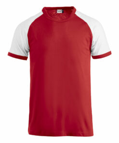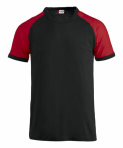 Kaksivärinen raglan T-paita, jossa kontrastiväriset hihat.
